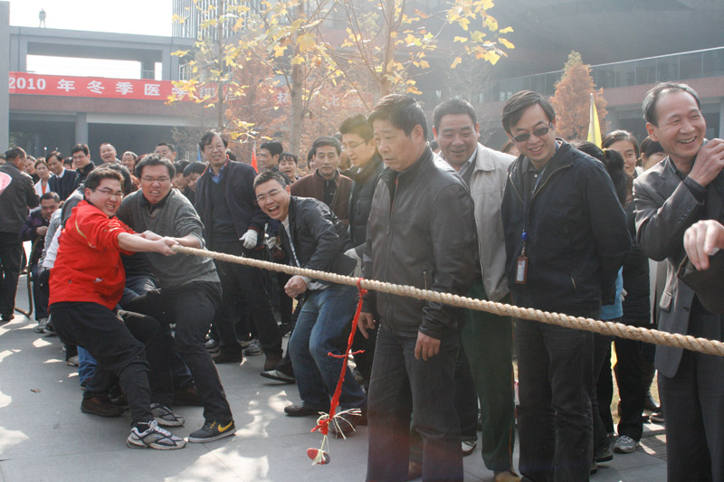 为了丰富全体教工业余生活,活跃气氛,营造团结向上的和谐氛围,牢固树立健康生活的理念。11月26日下午1:00,医学部工会主办、基础医学系工会承办的全体教工拔河比赛在医学部吴弘萍副书记的宣布下,正式拉开帷幕。本次拔河比赛由来自6家附属医院、药学院、公共卫生系、医学部机关和基础医学系共10支队伍参加,每队10名队员(5男5女),参赛队员各个精神饱满,他们紧握绳子,扎好马步,跃跃欲试。随着一声哨声响起,各方队员齐心协力,毫不示弱,使出全身力气抓住绳子往回拉。队员们屏住呼吸,目光的焦点随着绳子中间的红绳来回移动,比赛场面异常激烈。啦啦队更是表现出极大的热情,为队员们呐喊助威,时时爆发出热烈的掌声和欢呼声。经过紧张激烈的角逐,最后,附属二院拔河队荣膺冠军、附属一院、附属儿童医院、药学院分别荣获亚军、季军和鼓励奖,医学部工会副主席王亦夫老师、基础医学系工会主席周韧教授分别给获奖单位颁发奖状和奖金。