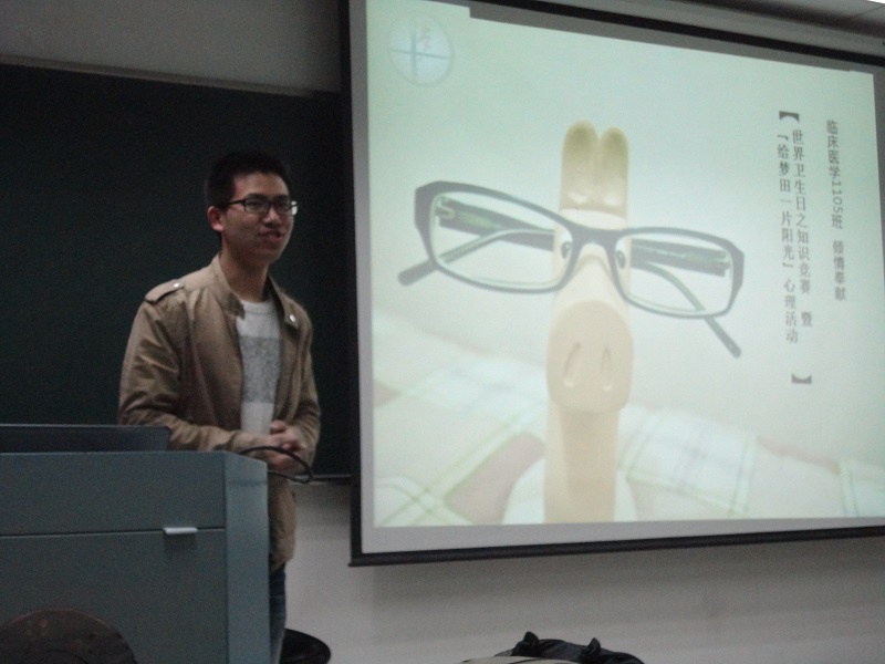 201447日晚上6:30,临床1105的同学欢聚西区空教室。一场名为“世界卫生日之知识竞赛暨‘给梦田一片阳光’心理活动”的班级主题生活会在此展开。团支部书记阮基浩主持了会议。