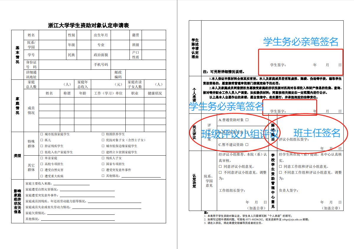 9月21日24:00之前,请学生完成上述相关申请,包括eta系统申请、《浙江大学学生资助对象认定申请表》(附件二)一式两份上交至班级资助对象认定评议小组。