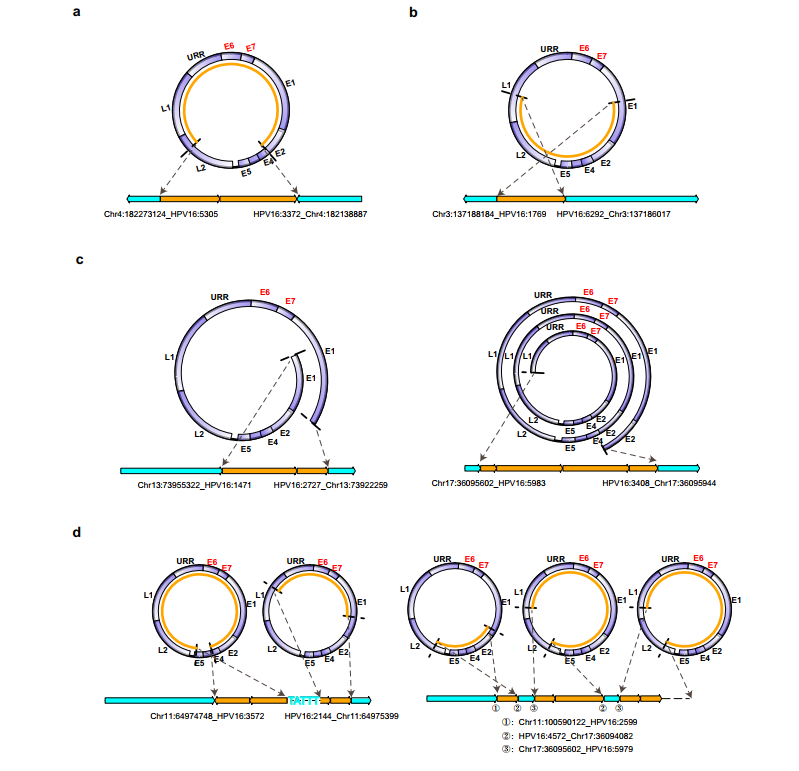 含有通常HPV致癌基因E6/E7的Type B从未被先前研究报道,但该整合类型在宫颈癌中并不罕见。我们亦发现了该整合类型和人类基因组上已知的致癌基因共同作用的证据,表明其仍有成为宫颈癌“driver”事件的潜力。